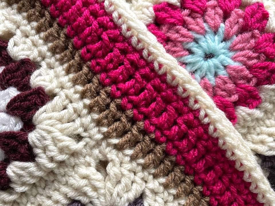 And I purchased all of the Caron Off White yarn that I used to make it into a square and to join and connect all the squares.  I used the single crochet method to join the squares and the rows.  It is joined by single crochet from the back.  Therefore the front and the back of the blanket will have a slightly different look (see picture below).  There are several methods to join granny squares but the single crochet is the one I’m most comfortable with.