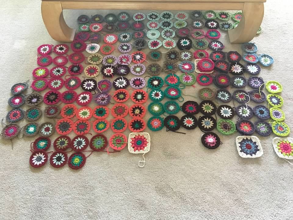As I started making the granny flowers I got on a roll and just crocheted away.  Before I knew it I had quite a few.  I decided to lay them out on the floor one night to see just how many I did have.  I was shocked at how fast it went…..