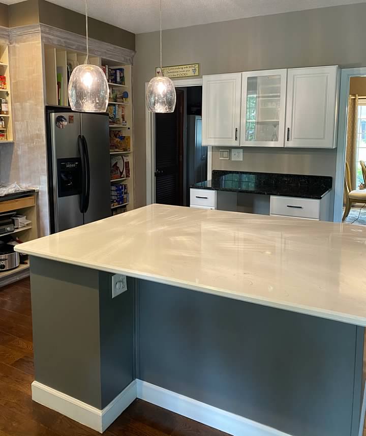 - Re-used the existing island granite countertop and added some new cabinets to make a coffee bar
