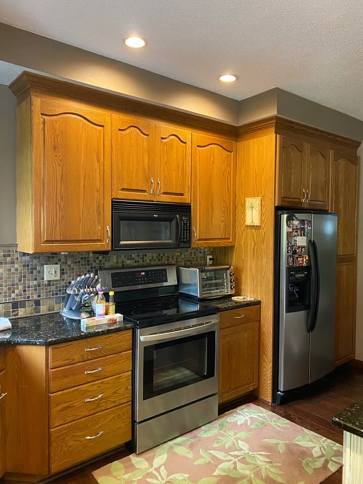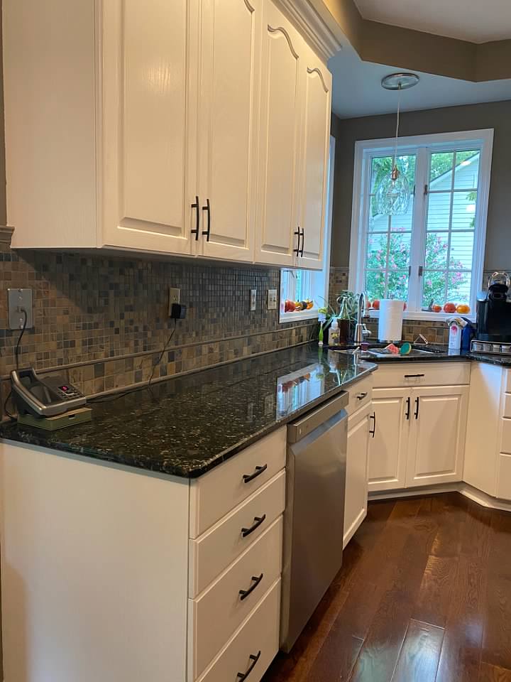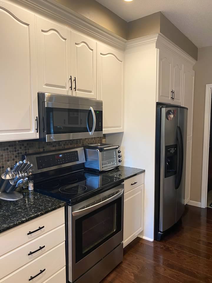 Not only did all of the changes we made update the kitchen and make it look clean and fresh, it also made the kitchen look so much larger! Going from oak cabinets to white and painting all the trim around the door facings and windows, brightened everything up and just made the space look more ROOMY and definitely more WELCOMING!