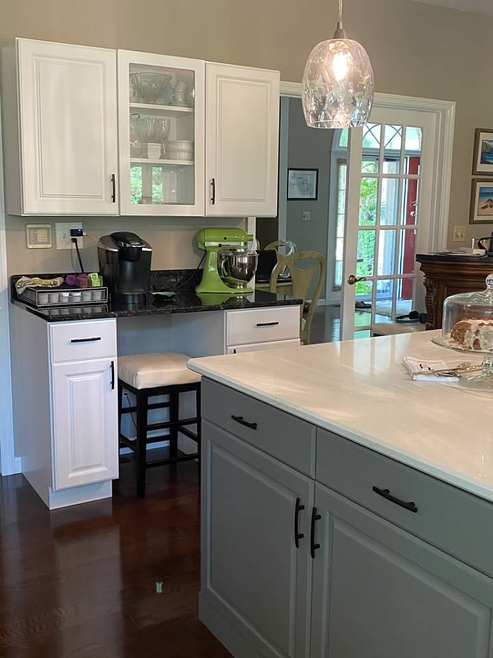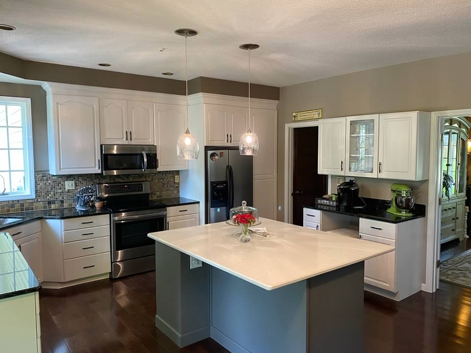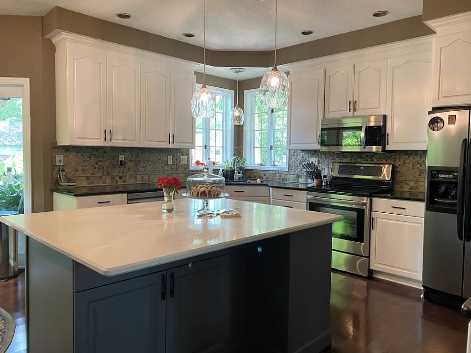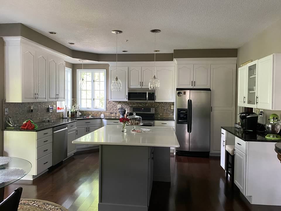 I knew when we started this project, with our main focus on having the cabinets painted, that it would be a huge change in appearance to the room. But I was unprepared for just how much of a change – Not only to the kitchen but the entire downstairs of our house. Our floor plan is very open and you can see the kitchen from every room but the bathroom.