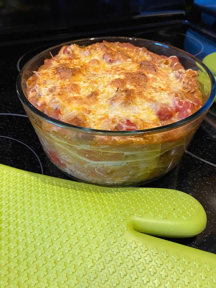 The dish I cooked my Mexican casserole in is the perfect size. The flour tortillas fit perfect in the round, 7 inches wide and 3 inches deep dish. Or if you don’t have a round casserole dish just use a 9-9 square dish or a deep-dish pie dish.