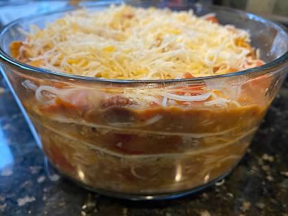 - In a casserole dish (preferably round if you have one), layer chicken mixture, cheese and flour tortillas. Repeat until all ingredients are used. To finish top with the rest of the cheese.