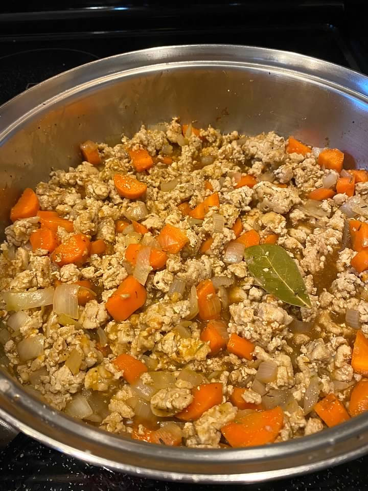 Spray a large, deep pan with cooking spray. Brown turkey, adding garlic, onion, carrots, celery. Cook until vegetables are starting to get tender. Add the bay leaf and thyme, salt and pepper (if desired).