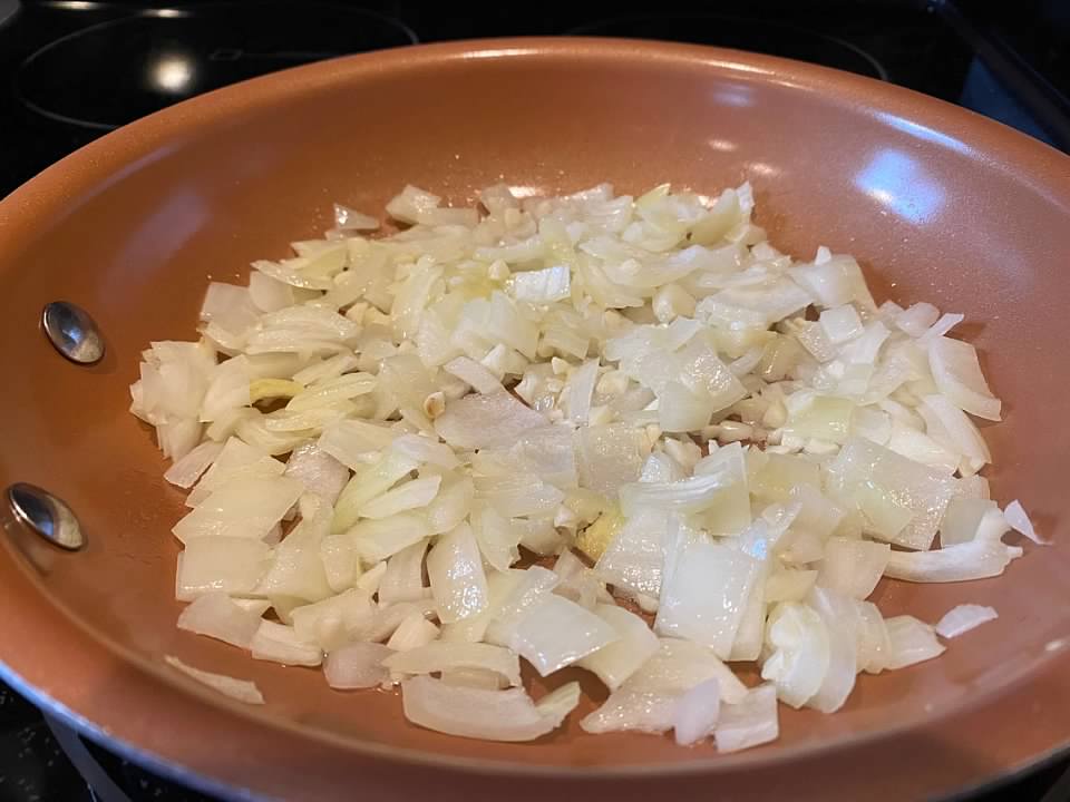 - Saute onion and garlic in olive oil or cooking spray until tender and translucent.